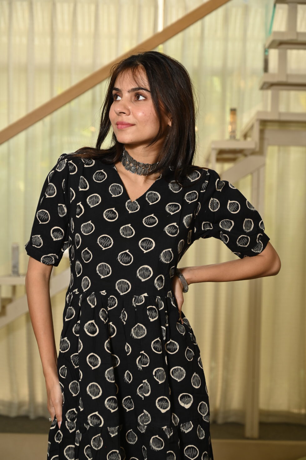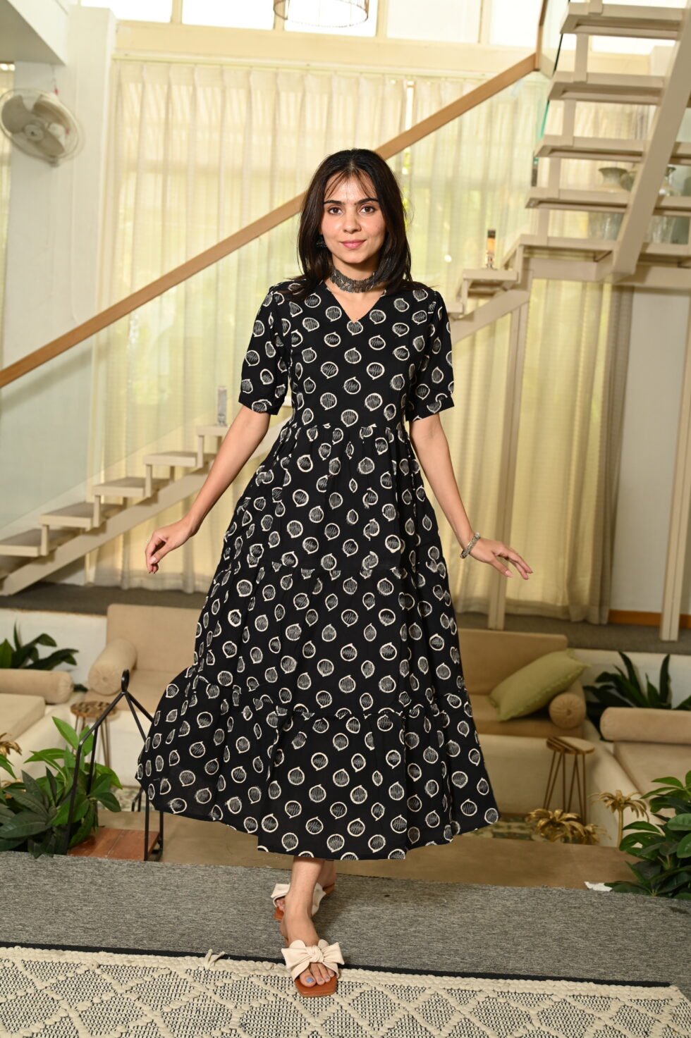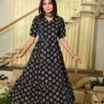 Elevate your everyday look with this Black Floral Printed Cotton Anarkali Maxi Dress, designed to blend comfort with chic style. Crafted from breathable cotton fabric, this dress features a beautiful all-over floral pattern that adds a touch of charm and femininity. The V-neckline and puff sleeves give it a trendy silhouette, while the flared tiered hemline ensures graceful movement with every step.