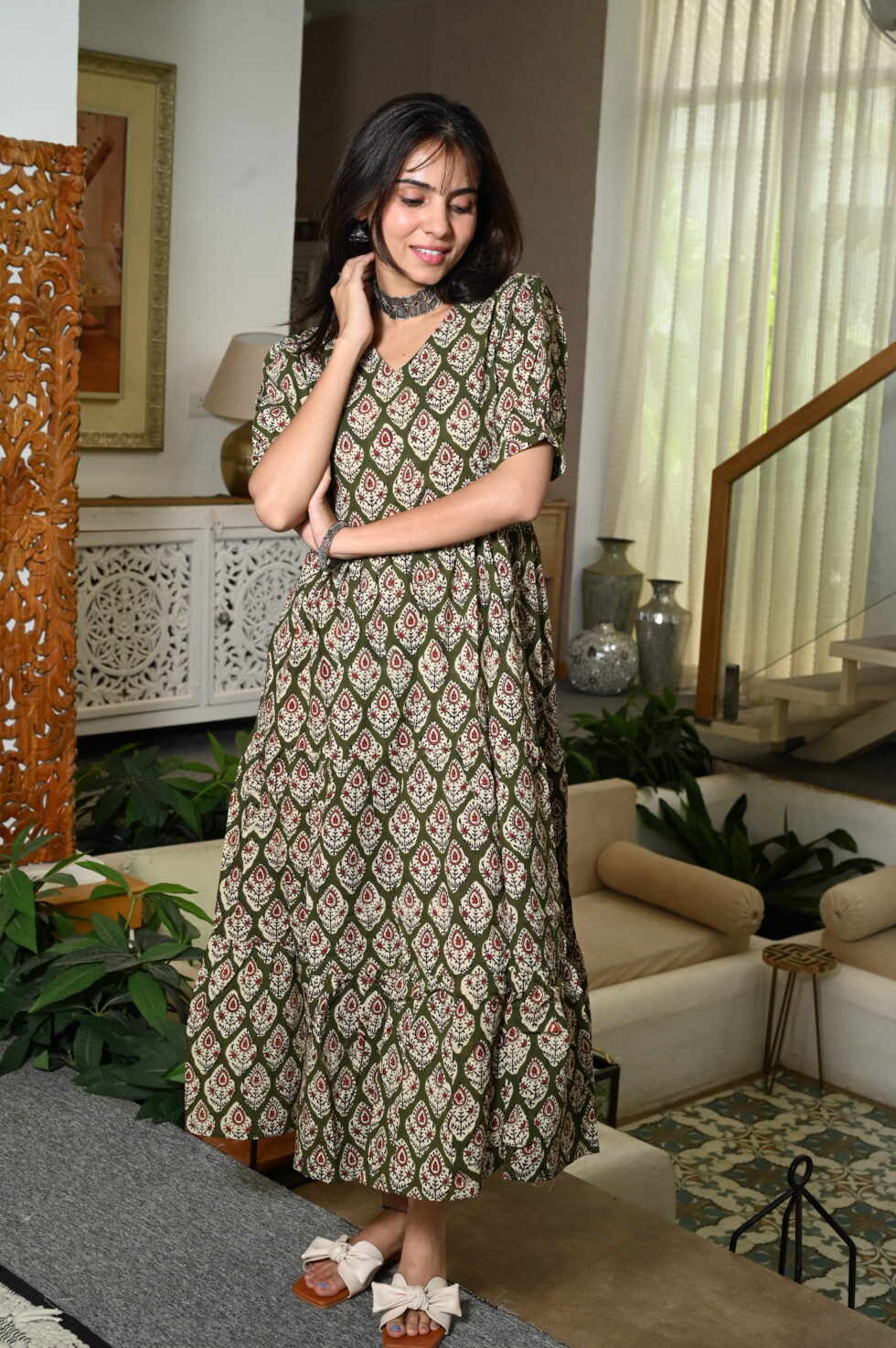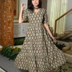 Elevate your everyday look with this Green Floral Printed Cotton Anarkali Maxi Dress, designed to blend comfort with chic style. Crafted from breathable cotton fabric, this dress features a beautiful all-over floral pattern that adds a touch of charm and femininity. The V-neckline and puff sleeves give it a trendy silhouette, while the flared tiered hemline ensures graceful movement with every step.