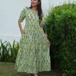 Elevate your everyday look with this Light Green Floral Printed Cotton Anarkali Maxi Dress, designed to blend comfort with chic style. Crafted from breathable cotton fabric, this dress features a beautiful all-over floral pattern that adds a touch of charm and femininity. The V-neckline and puff sleeves give it a trendy silhouette, while the flared tiered hemline ensures graceful movement with every step.
