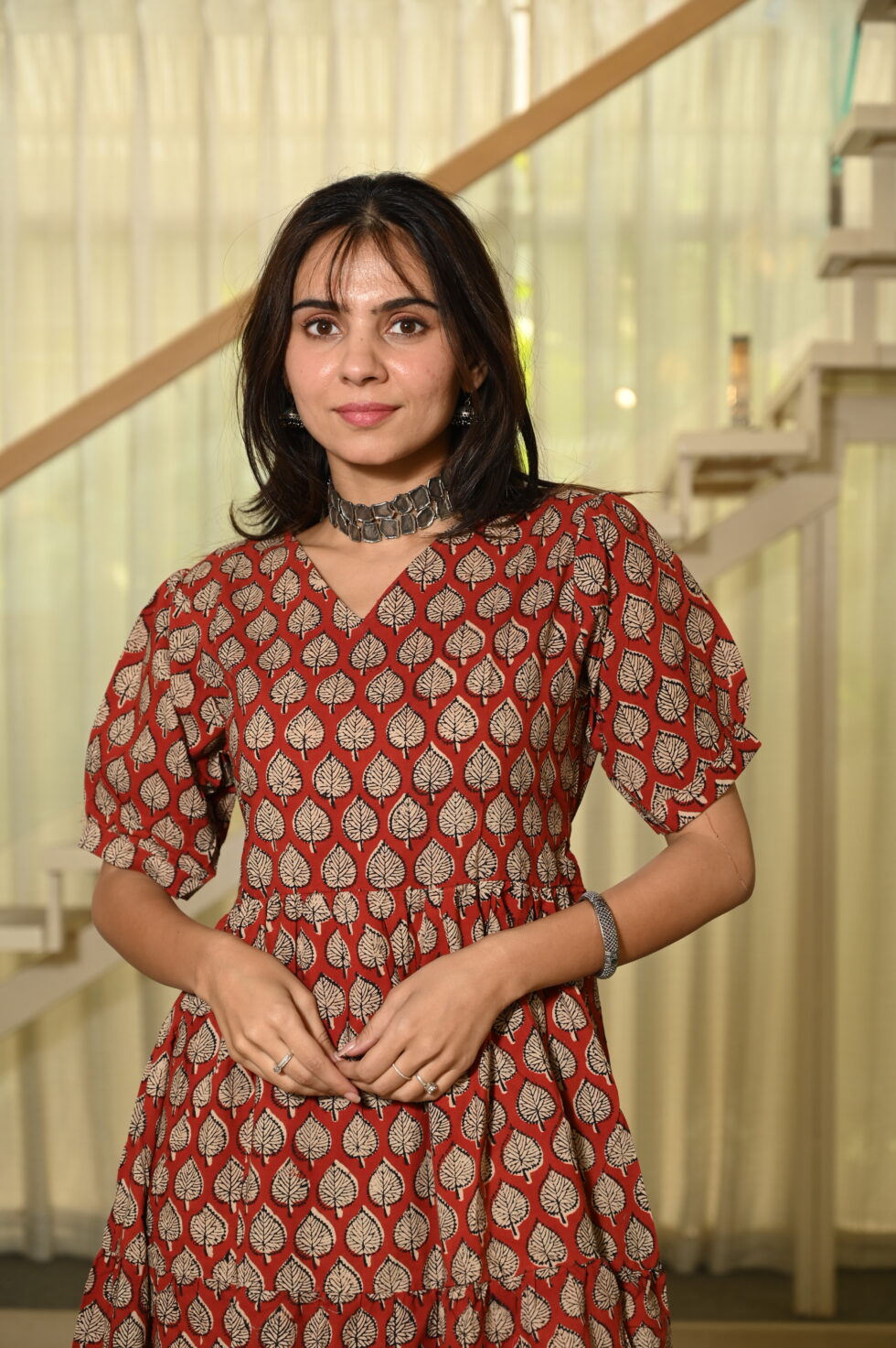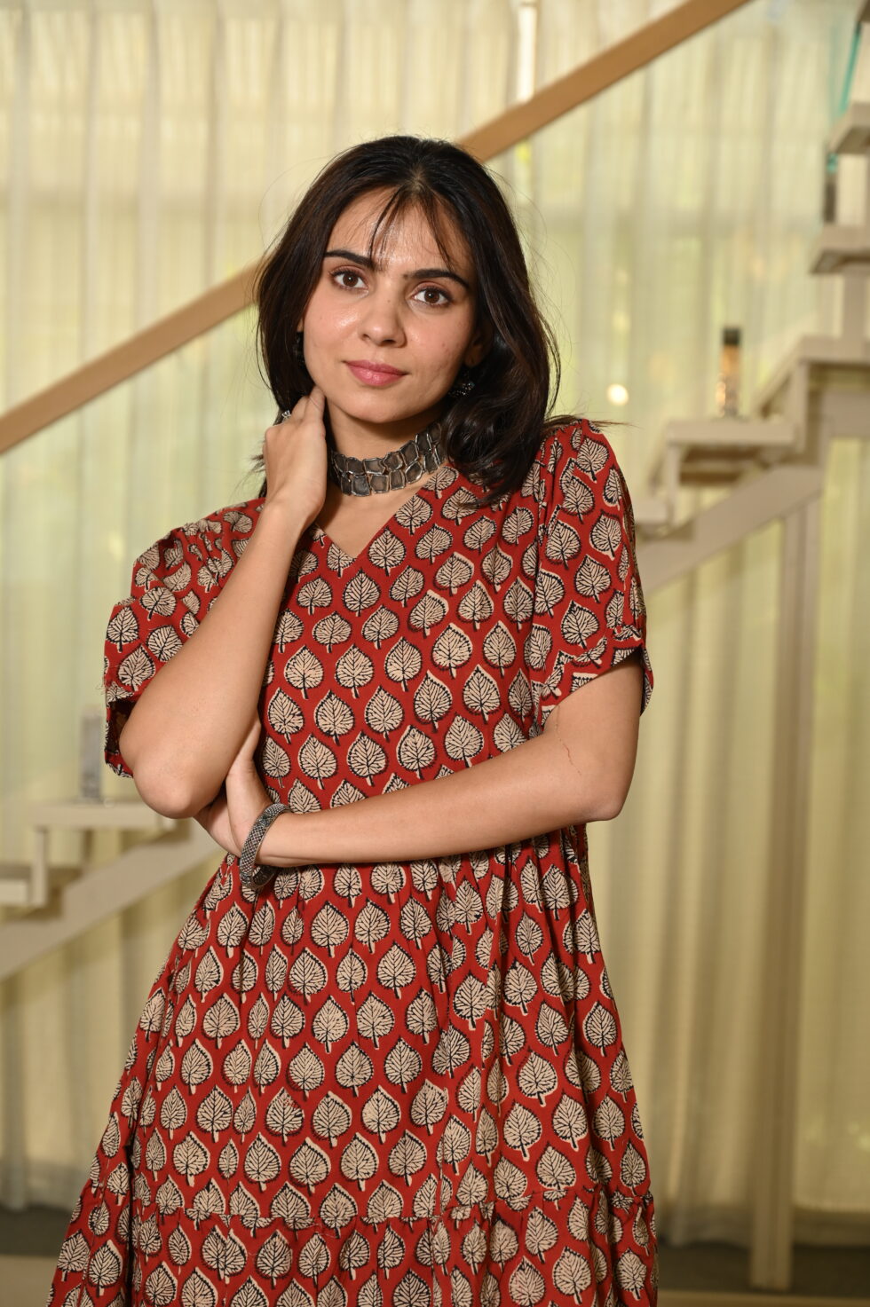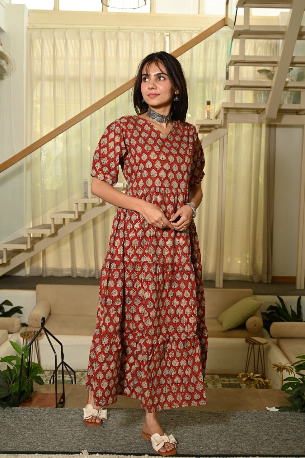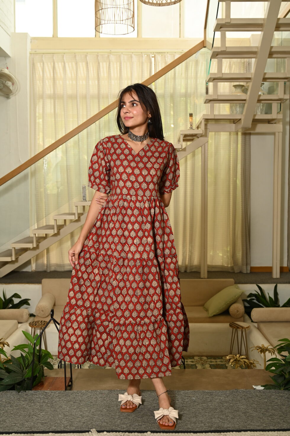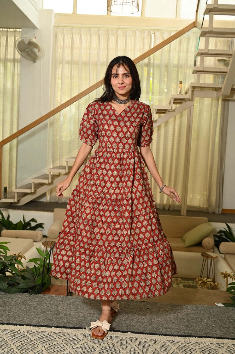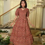 Elevate your everyday look with this Red Floral Printed Cotton Anarkali Maxi Dress, designed to blend comfort with chic style. Crafted from breathable cotton fabric, this dress features a beautiful all-over floral pattern that adds a touch of charm and femininity. The V-neckline and puff sleeves give it a trendy silhouette, while the flared tiered hemline ensures graceful movement with every step.