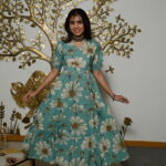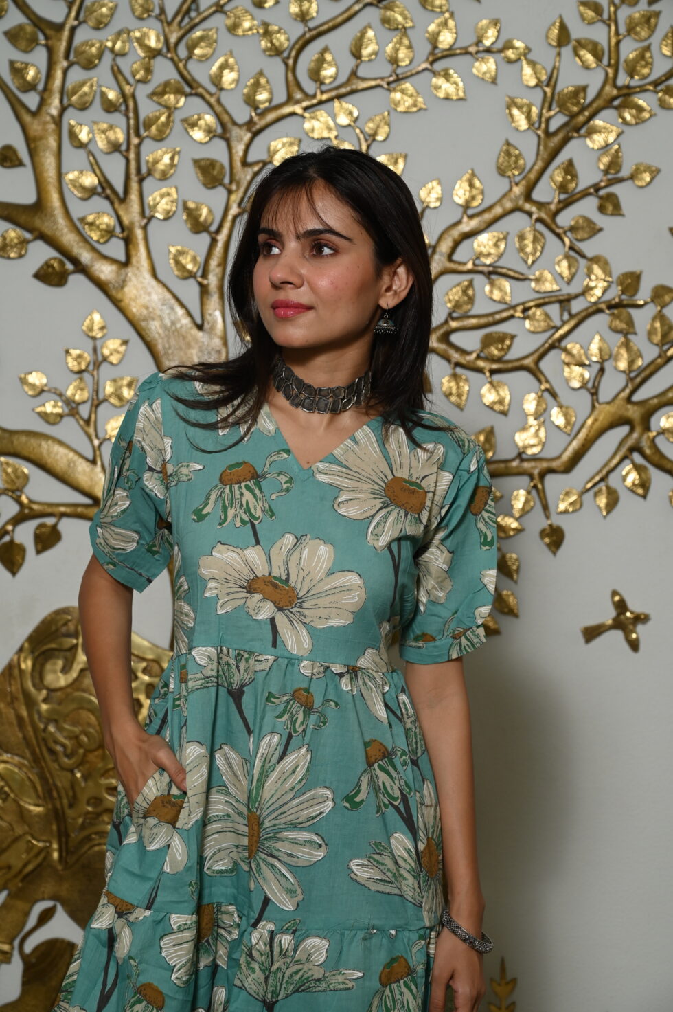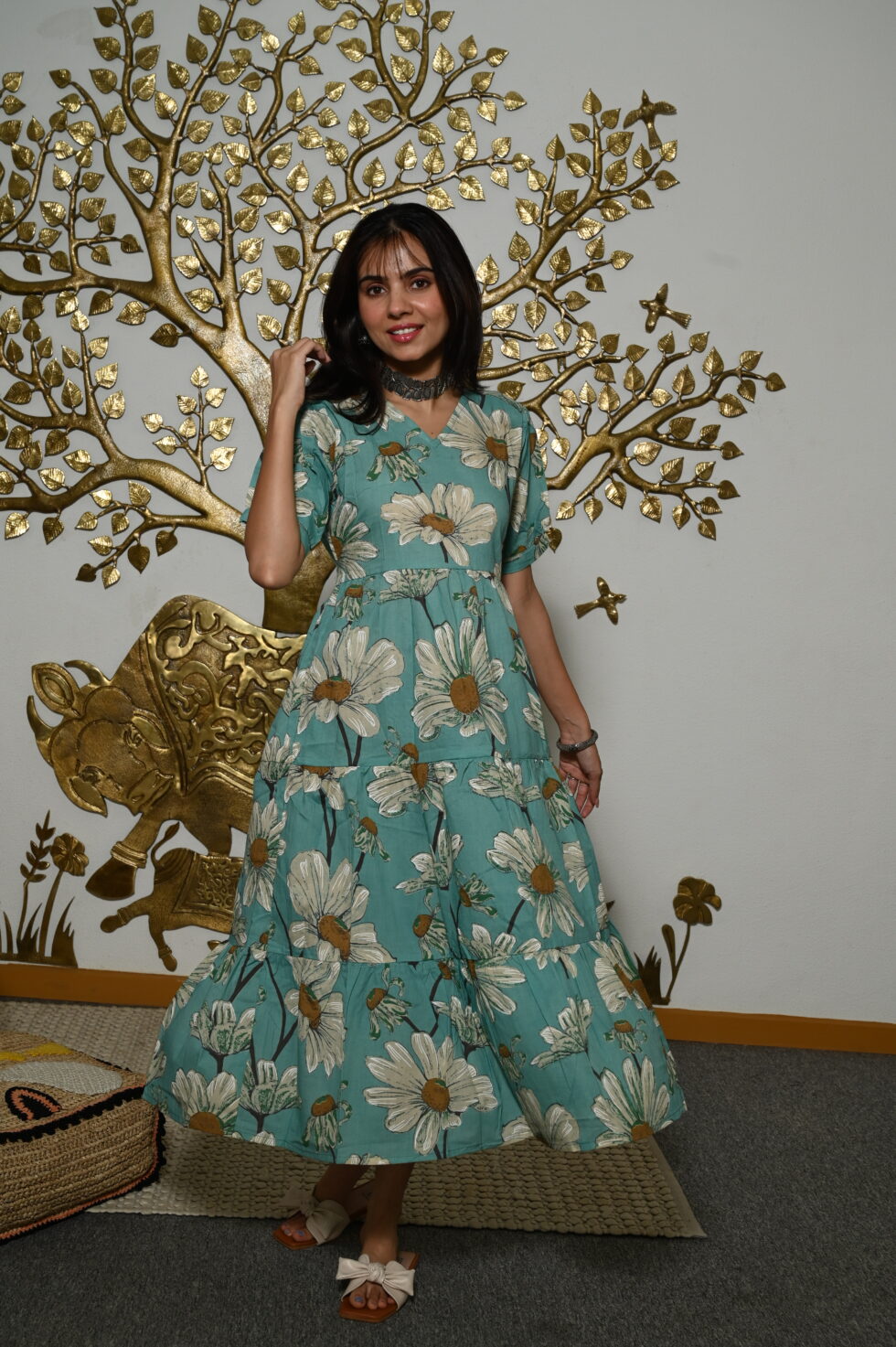 Elevate your everyday look with this Teal-Blue Floral Printed Cotton Anarkali Maxi Dress, designed to blend comfort with chic style. Crafted from breathable cotton fabric, this dress features a beautiful all-over floral pattern that adds a touch of charm and femininity. The V-neckline and puff sleeves give it a trendy silhouette, while the flared tiered hemline ensures graceful movement with every step.